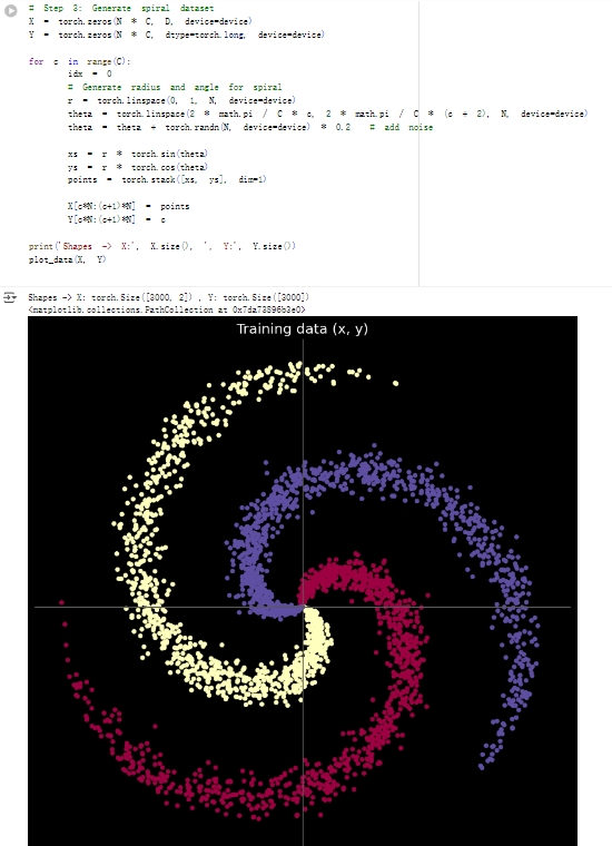 原因与方案: 检查发现是标签张量 Y 的类型未设置为整型long,导致绘图函数无法正确区分类别。将 Y 定义修改为dtype=torch.long 后,三类螺旋臂在可视化图中颜色区分明显。