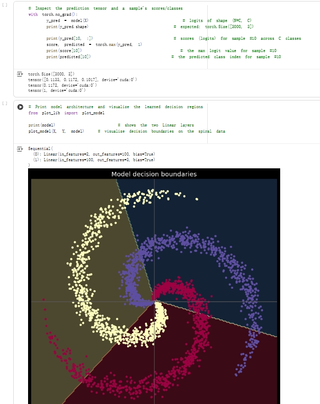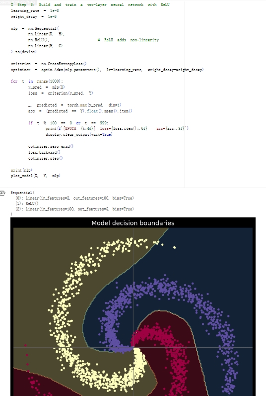 在两层Linear之间加入ReLU()使得网络具备了非线性表达能力,可以用分段线性的方式逼近复杂边界。可见对螺旋这种高度非线性的分布,这一步是从从不能到能学到的根本性跃迁。